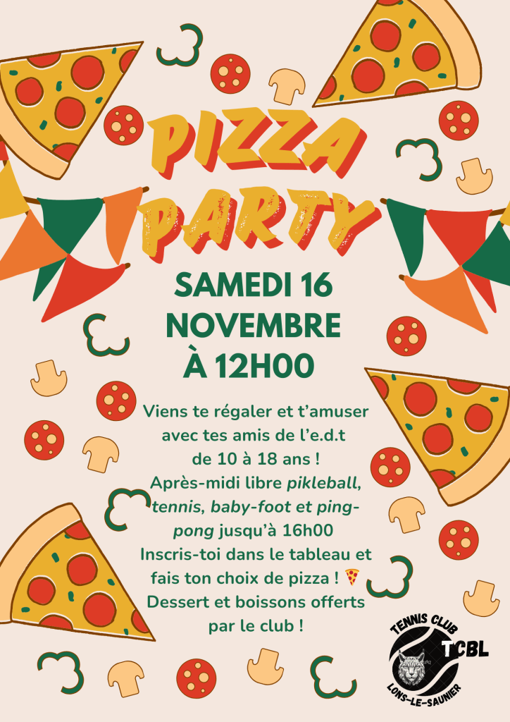 Publié le 14 octobre 2024 in École Pizza Party samedi 16 novembre Inscription sur la feuille accrochée sur le tableau d’affichage dans l’entrée du club. Partager : Cliquer pour partager sur X(ouvre dans une nouvelle fenêtre) X Cliquez pour partager sur Facebook(ouvre dans une nouvelle fenêtre) Facebook J’aime chargement…
