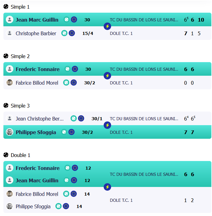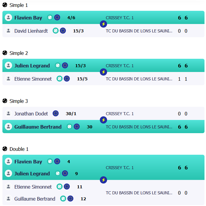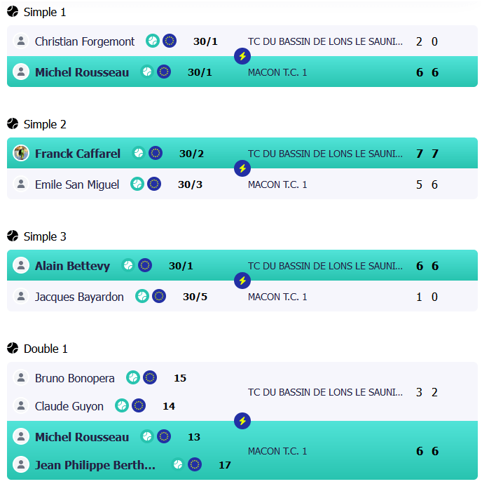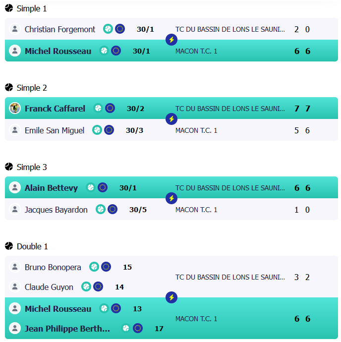 Publié le 12 novembre 2024 in Compétition Championnat par équipes senior plus – J4 Résultats de la quatrième journée des interclubs senior + le 12/11 et le 7/11 : Hommes + 35 : CRISSEY TC / TCBL : 4/1 + 55 : TCBL / DOLE : 4/1 + 65 : TCBL / MACON : 2/3 Partager : Cliquer pour partager sur X(ouvre dans une nouvelle fenêtre) X Cliquez pour partager sur Facebook(ouvre dans une nouvelle fenêtre) Facebook J’aime chargement…
