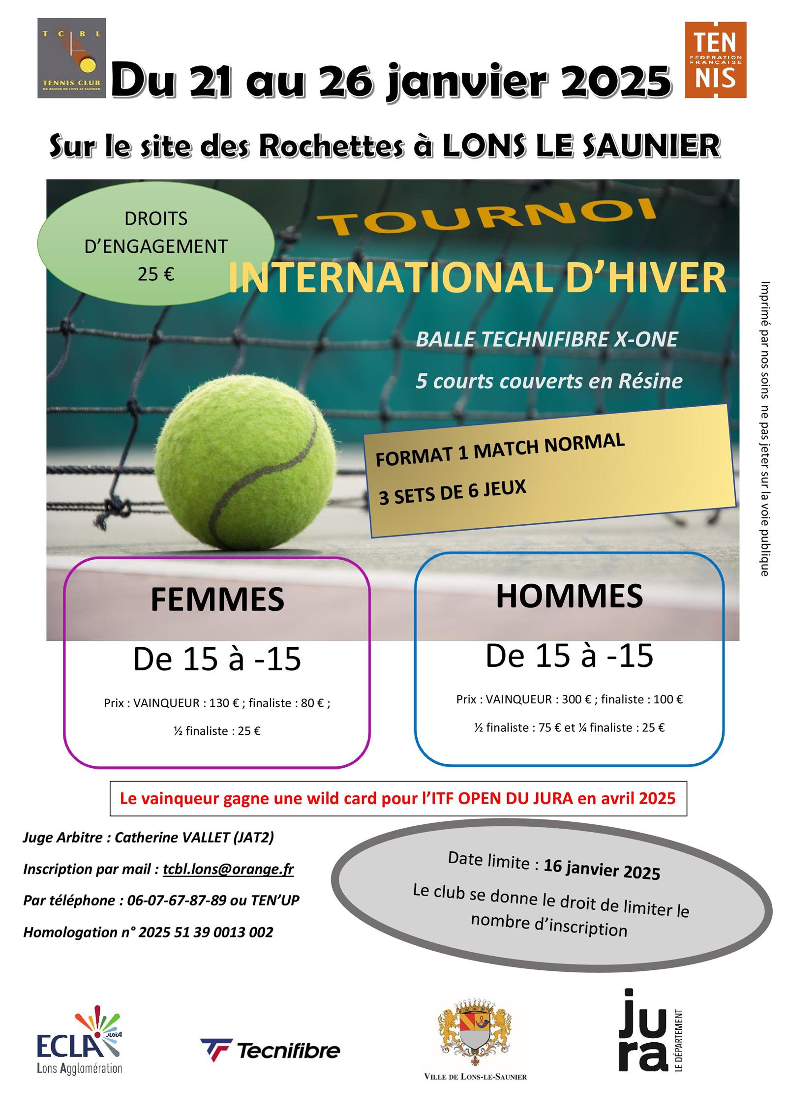 Publié le 29 novembre 2024 in Compétition Wild Card ITF au tournoi d’hiver 2025 Notre tournoi International d’hiver H/F aura lieu du 20 au 26 janvier 2025. La vainqueur du tournoi Hommes recevra une WILD CARD pour l’Open du Jura ITF 20000$ qui aura lieu du 30 mars au 6 avril 2025 à Lons-le-Saunier. Partager : Cliquer pour partager sur X(ouvre dans une nouvelle fenêtre) X Cliquez pour partager sur Facebook(ouvre dans une nouvelle fenêtre) Facebook J’aime chargement…