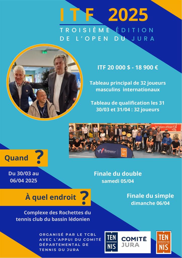 Publié le 20 janvier 2025 in Open du Jura Open du Jura ITF 2025 L’Open du Jura est reconduit cette année du 30 mars au 6 avril 2025.Le Comité Directeur vous convie à une réunion le mardi 28 janvier à 19h pour de plus amples renseignements quant au déroulement du tournoi. Le club a besoin de vous ! Partager : Cliquer pour partager sur X(ouvre dans une nouvelle fenêtre) X Cliquez pour partager sur Facebook(ouvre dans une nouvelle fenêtre) Facebook J’aime chargement…