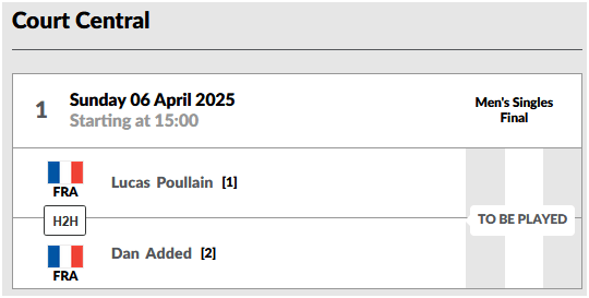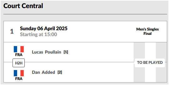 Publié le 5 avril 2025 in Open du Jura Open du Jura : programme du dimanche 6 avril Ce dimanche au TCBL c’est la grande finale du tournoi de simples à 15 h entre Lucas Poullain et Dan Added. Et avant la finale, vers 13h45, vous pourrez assister à une exhibition autour du Paratennis avec Justin Michel. Partager : Cliquer pour partager sur X(ouvre dans une nouvelle fenêtre) X Cliquez pour partager sur Facebook(ouvre dans une nouvelle fenêtre) Facebook J’aime chargement…