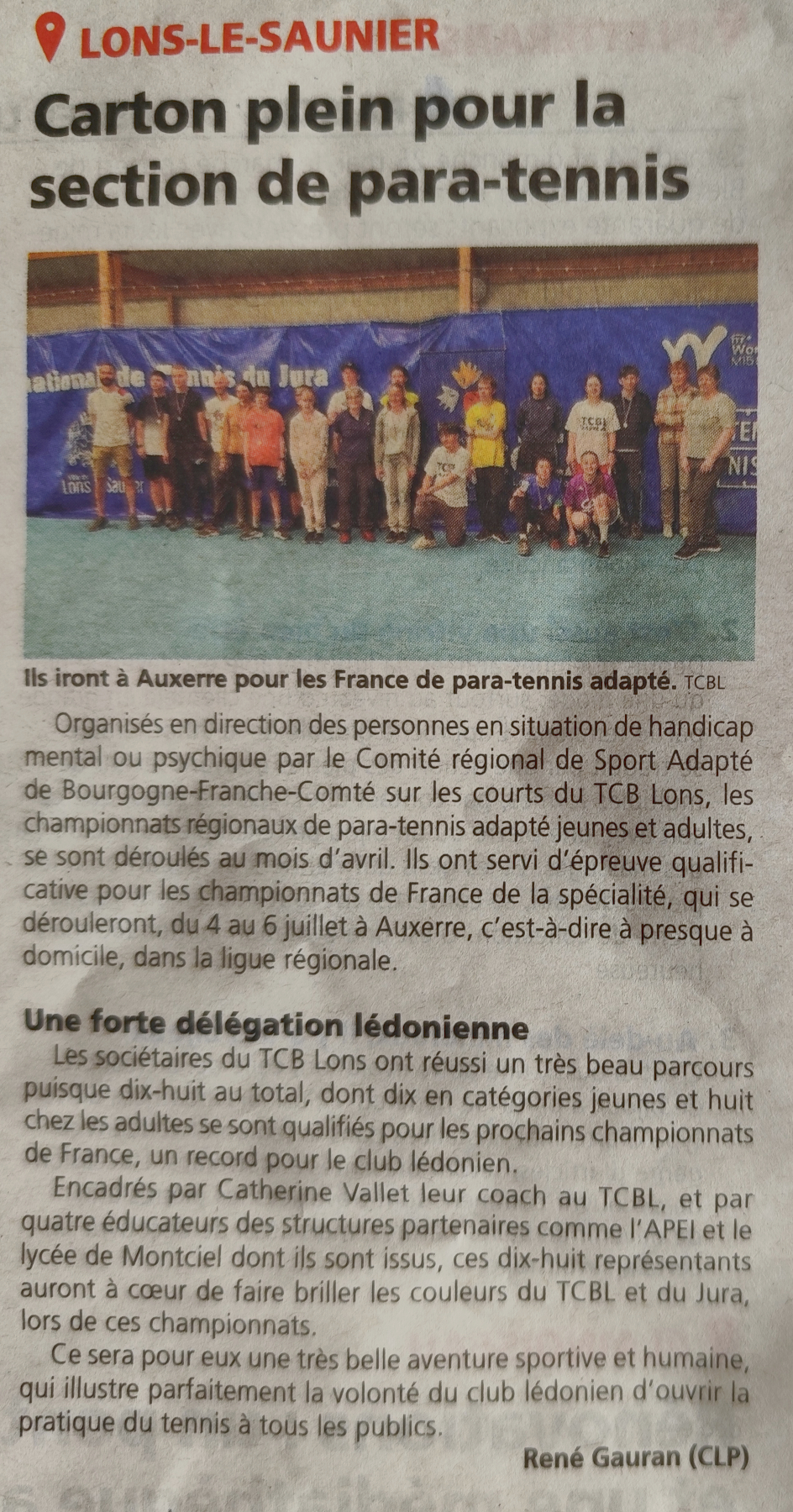 Encadrés par le coach du TCBL, Catherine VALLET, et par quatre éducateurs des structures partenaires du club et dont ils sont issus, l’APEI et le lycée MONTCIEL, nos 18 représentants auront à coeur de faire briller les couleurs du TCBL et du Jura lors des championnats de France.