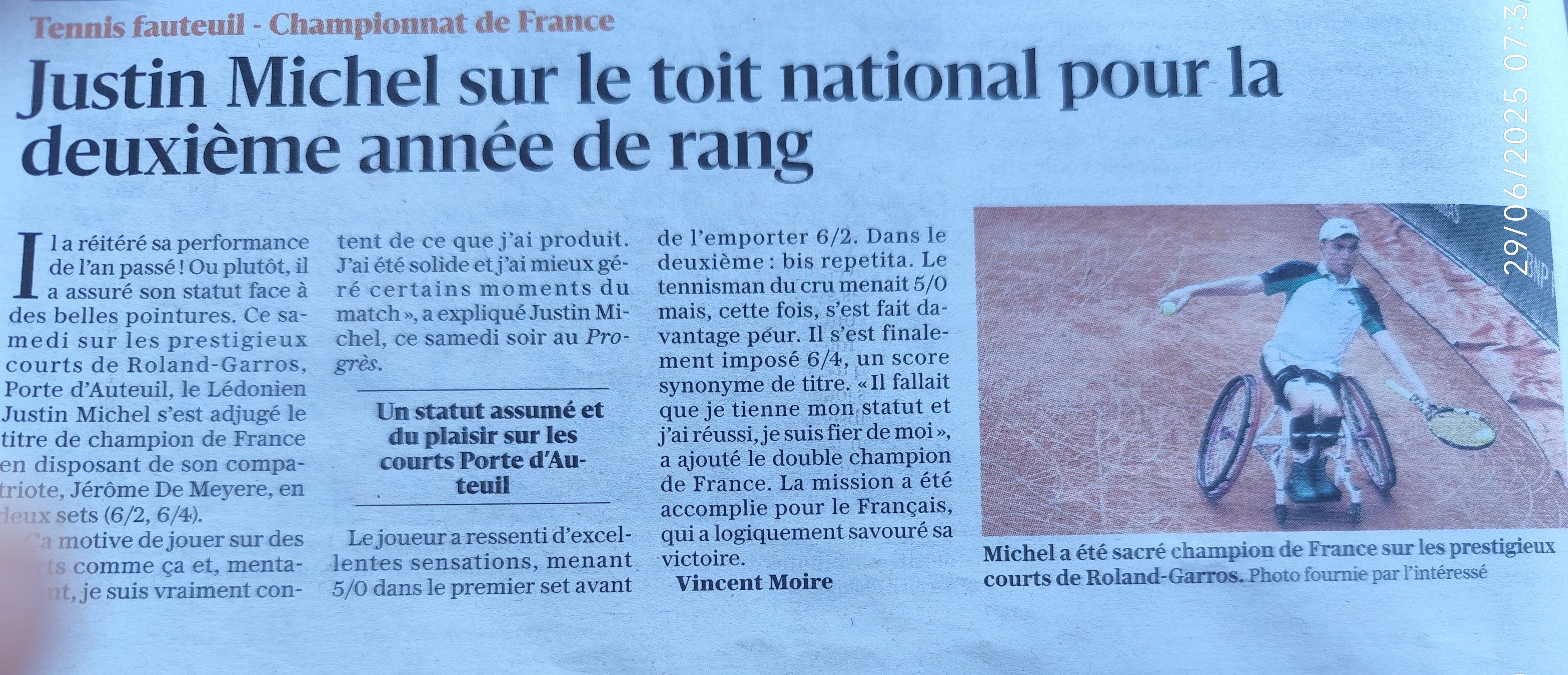 Publié le 30 juin 2025 in Compétition, Paratennis Justin Michel conserve son titre ! Justin a été sacré champion de France, catégorie Quad, ce weekend à Roland Garros (il conserve son titre). Chapeau ! Partager : Cliquer pour partager sur X(ouvre dans une nouvelle fenêtre) X Cliquez pour partager sur Facebook(ouvre dans une nouvelle fenêtre) Facebook J’aime chargement…