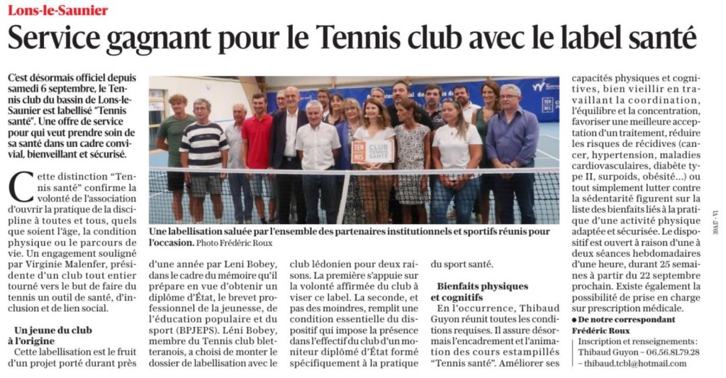 Publié le 11 septembre 2025 in Communication Remise du label « Tennis Santé » Ce samedi 6 septembre a eu lieu la cérémonie de remise du label Tennis Santé au TCBL. Le club propose des cours spécifiques assurés par Thibaud Guyon, moniteur formé au tennis santé. Renseignements : thibaud.tcbl@hotmail.com – 06 56 81 79 28 Partager : Cliquer pour partager sur X(ouvre dans une nouvelle fenêtre) X Cliquez pour partager sur Facebook(ouvre dans une nouvelle fenêtre) Facebook J’aime chargement…