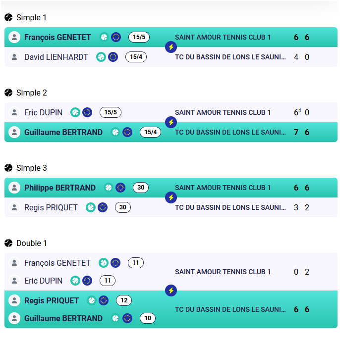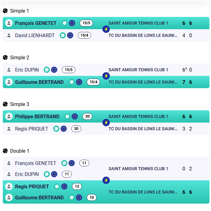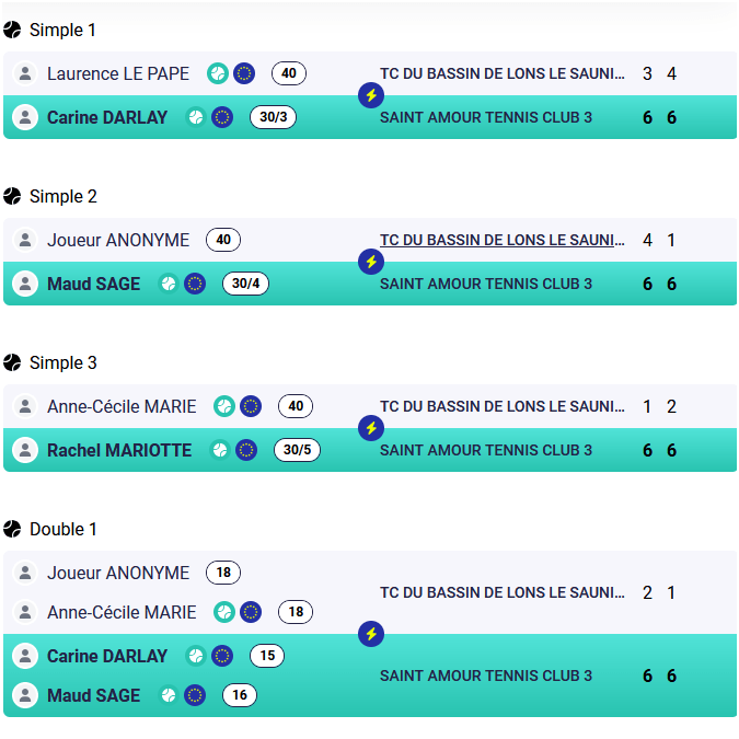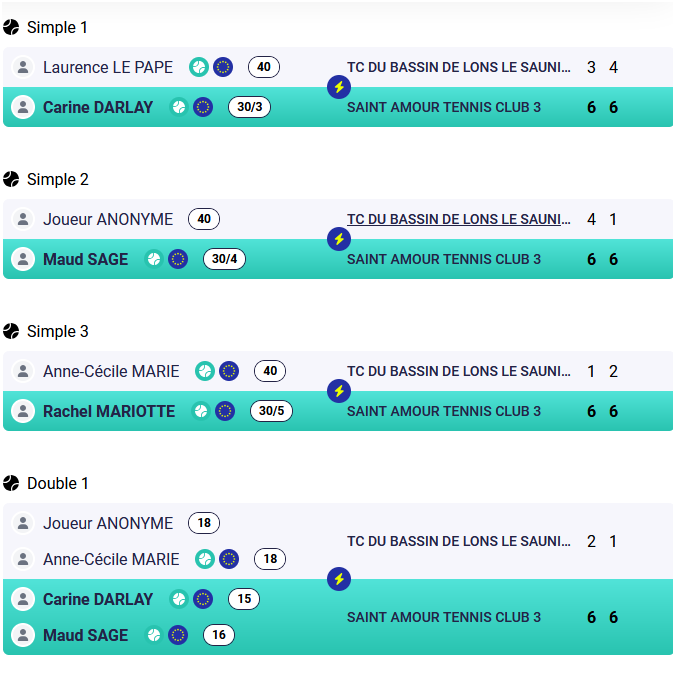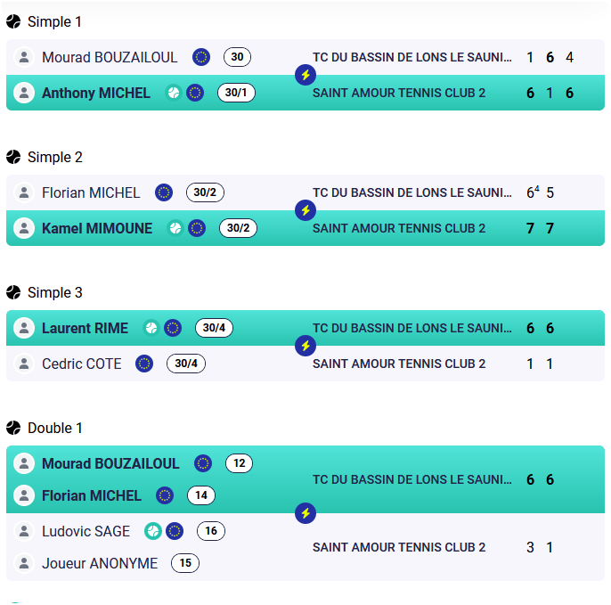 - +35 : TCBL 2 / SAINT AMOUR TENNIS CLUB 3 : 0/5
