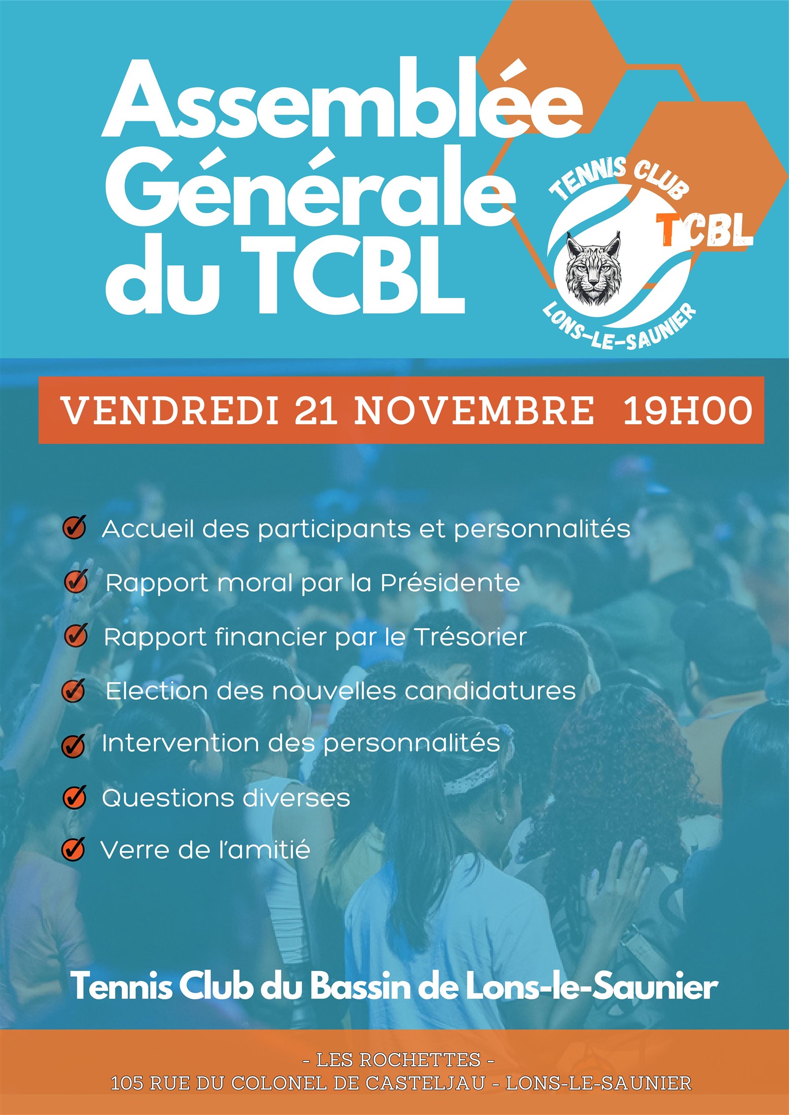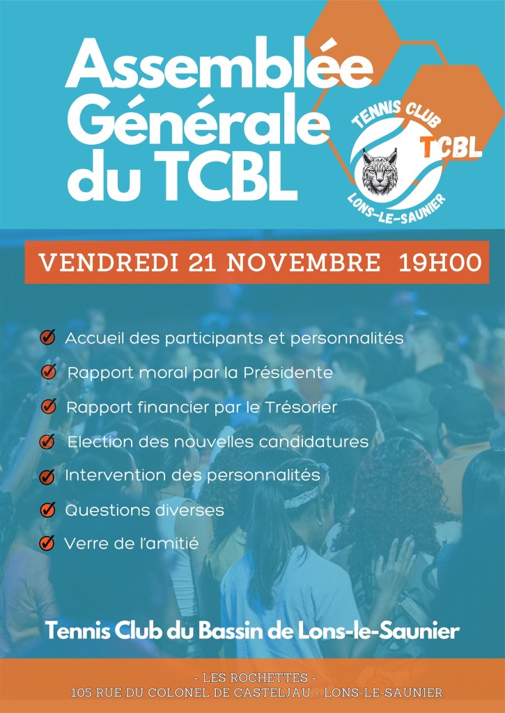Publié le 1 novembre 2025 in Communication Assemblée Générale le 21 novembre L’assemblée générale du TCBL aura lieu le vendredi 21 novembre 2025 aux Rochettes à partir de 19 h. Partager : Cliquer pour partager sur X(ouvre dans une nouvelle fenêtre) X Cliquez pour partager sur Facebook(ouvre dans une nouvelle fenêtre) Facebook J’aime chargement…