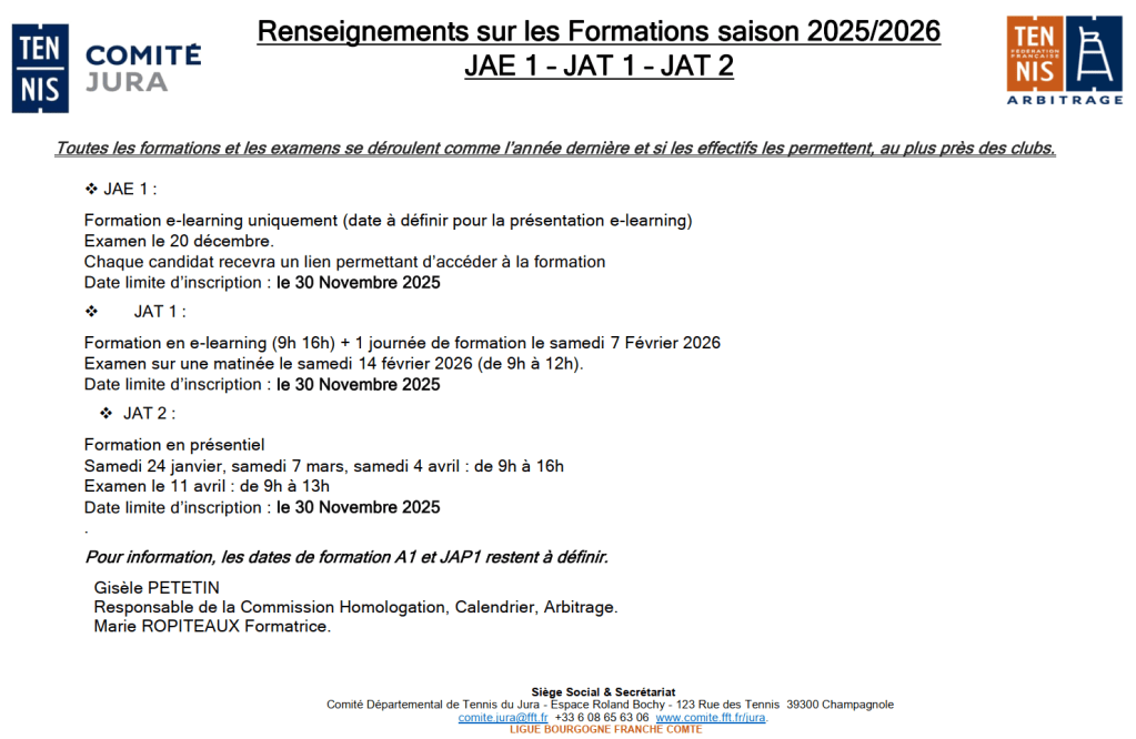 Voici les informations relatives aux formations de JAE 1, JAT 1, JAT 2 qui auront lieu prochainement.