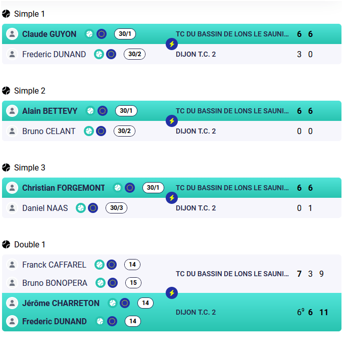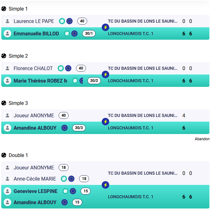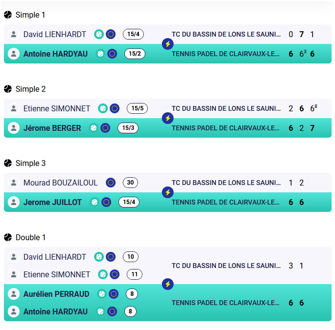 - +35 : TCBL 1 / TENNIS PADEL DE CLAIRVAUX-LES-LACS 1 : 0/5